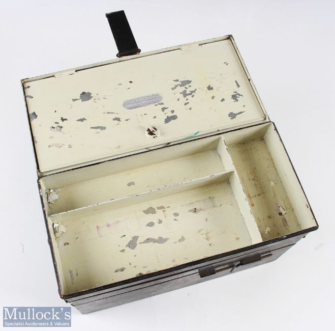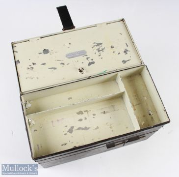The Holborn Surgical Instruments, London, black japanned cantilever box, 11 1/2" x 6" x 8 1/2", 4x trays, lid with inner lock lid, one tray with 3x section and base with two, sliding front latch and leather carry handle