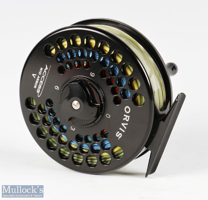 Orvis USA Access Mid Arbor trout fly reel, 4" spool, 2 screw latch, counter balanced handle, large rear tensioner, Orvis padded case, runs very well, very light use
