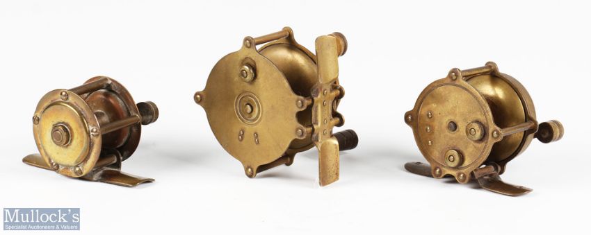 Collection of small brass Seminole style reels, made up of: 1x size 80 (on foot) 2" multiplier winch, counter balanced handle, on/off check and regulator, runs well; 1x size 40 (on foot) 1 5/8" multiplier winch, counter balanced handle, on/off check (needs attention); 1x no size, 1 1/2" winch with counter balanced handle, runs well. All look original (3)