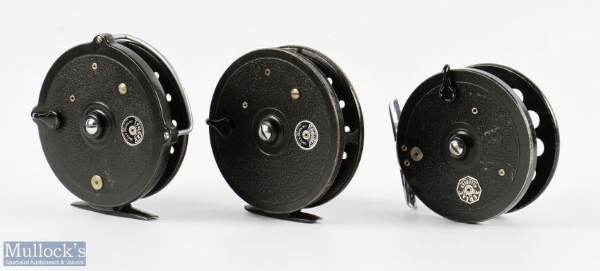 JW Young & Son 4" Trudex centre pin reel twin handle, in black finish, line guide, in original box, together with a Youngs 4" Rapidex centre pin reel in black finish, twin handle, plus a Allcock Aerial 3.75 centre pin reel in black finish, caged spool core, on/off check - both good condition overall (3)