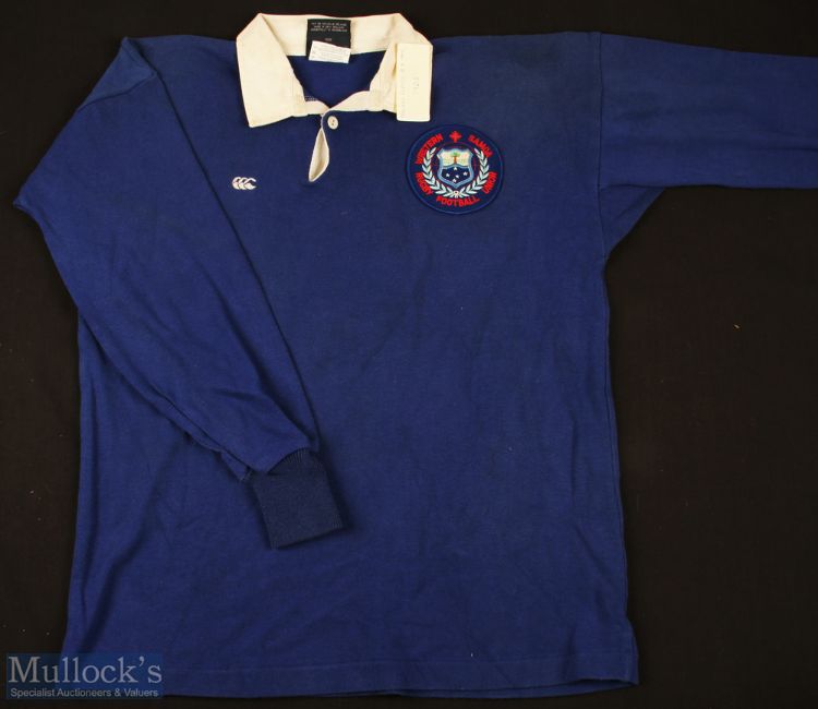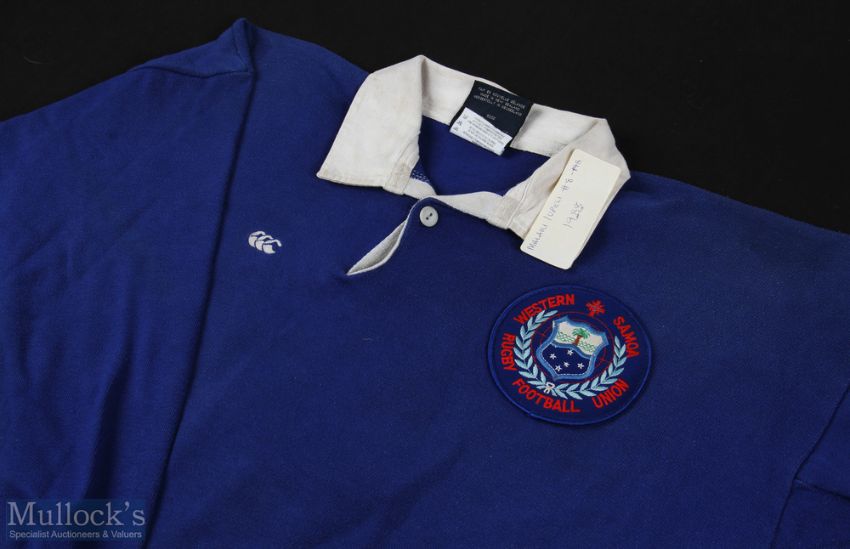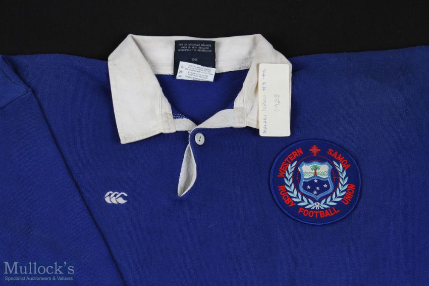 1988 Matchworn Western Samoa Rugby Jersey: Malaki Iupeli's no.8 jersey, blue with logo, Canterbury make, number is a white adhesive digit to reverse. Exchanged with B Mullin post match and donated to current vendor. VG