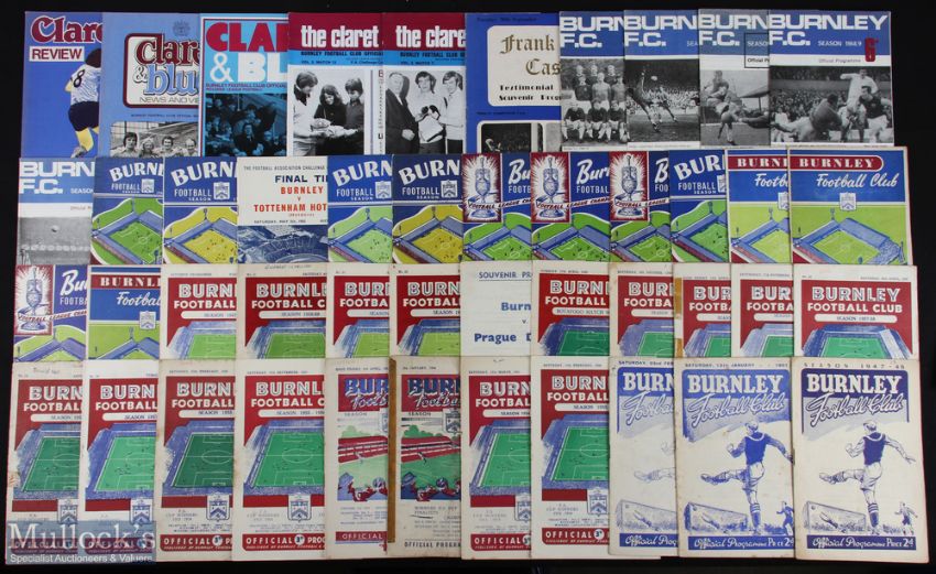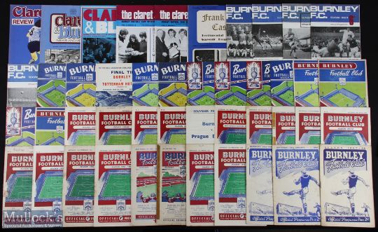Selection of Burnley programmes 1947/48 Swindon Town (FAC), 1950/51 Huddersfield Town, 1951/52 Liverpool (FAC), 1952/53 Preston NE, 1953/54 Manchester Utd (FAC) (poor), 1954/55 Sheffield Wednesday, 1955/56 Sheffield Utd, Birmingham City, Cardiff City, Botafogo (Brazil), 1956/57 Blackpool, Manchester Utd (poor), Wolves, 1957/58 Bolton Wanderers, Aston Villa (poor), Bristol Rovers (FAC), LKS Lodz (friendly), 1958/59 Chelsea, Portsmouth (FAC), Blackpool, Prague Dynamo (friendly), Gt. Britain Olympic team (single sheet), Leeds Utd, Lincoln City (FAC), Bradford City (FAC), 1960/61 Nottingham Forest, Sheffield Wednesday, Bournemouth (FAC), Reims (EC), 1961/62 Everton, Tottenham Hotspur (FAC final), 1962/63 Bolton Wanderers, 1963/64 Newport County (FAC), Rotherham Utd (FAC), 1965/66 Southampton (FLC), 1966/67 Lausanne Sports + team sheet, 1967/68 WHU (FAC), Nottingham Forest, 1968/69 Derby County (FAC), 1969/70 Manchester Utd (FLC), Leeds Utd, 1971/72 Manchester Utd (FLC), 1972/73 Liverpool (FAC), 1973/74 Wrexham (FAC), 1975/76 Norwich City, 1977/78 Notts. County; fair. (46)