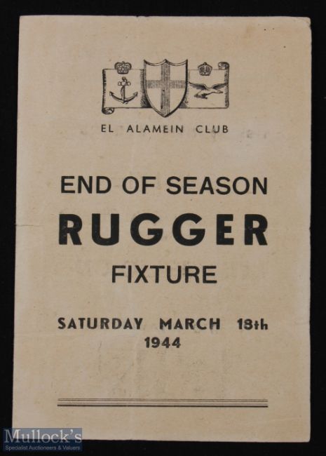 Rare 1944 Wartime Rugby in Egypt Programme: One of the frail but so-atmospheric issues from the famed El Alamein Club in Cairo, a Mar 18th curtain raiser between the Canal Area UDF v a UDF XV, then the 6th S African Division v the New Zealand Base Depot: each in their national colours! Watt & Kenyon in the SA ranks. This was one of three such clashes, the Boks edging them, 2-1. VG