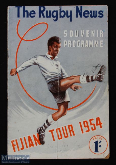 1954 NSW v Fiji Rugby Programme: Full 32 pp issue with striking cover for this colourful tour, twice signed by S African cap Tjol Lategan. VG