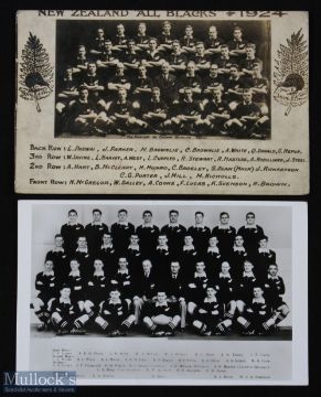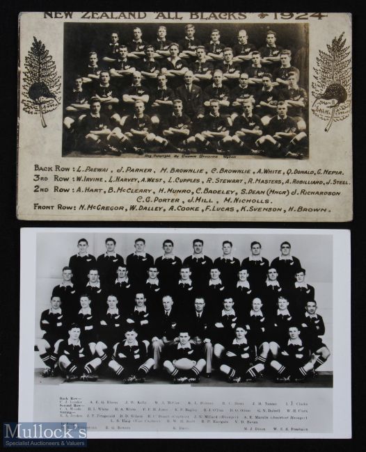 1924/1953 NZ All Blacks in the UK Rugby Postcards (2): 1924 'Invincibles' team group with Fern & Kiwi 'badges' and fully named caption; and 1953-4, named with facsimile signatures to reverse. G