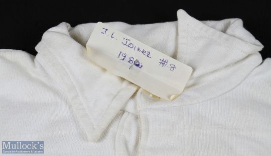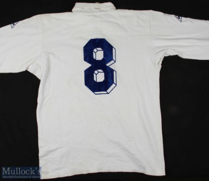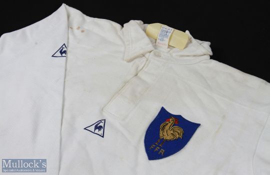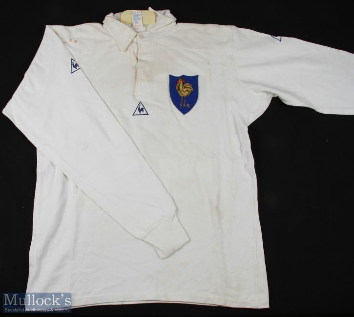 1980s Matchworn France Rugby Jersey: J-L Joinel's no. 8 jersey, white with blue FFR & cockerel shield badge, Le Coq Sportif made, named to Joinel on label, stylised blue & white 8 to reverse. VG