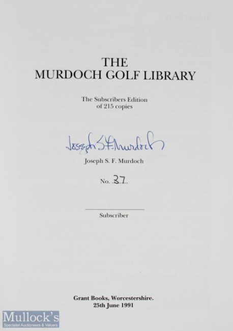 Murdoch, Joseph S F - 'The Murdoch Golf Library' signed 1st ed 1991 ltd to 215 subscription copies of which this is No.37 copy - publ'd by Grant Books and signed by H R J Grant presented to Alan Jackson on winning Presidents Medal at AGM Hoylake BGCS - in blue and gilt cloth boards c/w dust jacket, appears unread with original slipcase (VG)