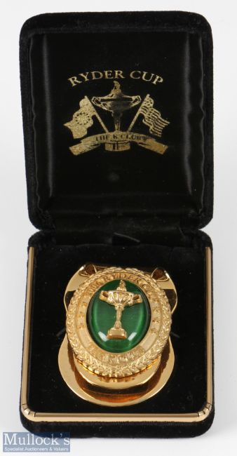 2006 Official Ryder Cup Presentation Gilt Embossed and Engraved Players/Official Money Clip - played at The K Club Ireland - with an emerald, green centre - made by master Jeweller and Sculptor Malcolm DeMille Inc USA - comes in maker's original box.