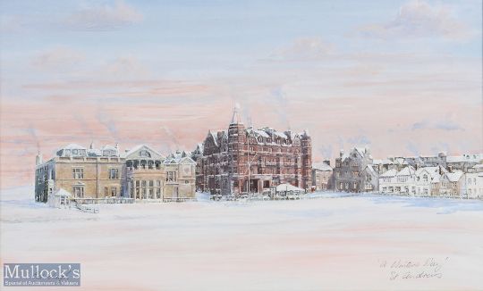 Bill Waugh "A Winters Day St Andrews" water colour on board snow covered Old Golf Course and The R&A Club House - signed to the lower left hand corner - image 10.75" x 17.75" overall 18.5" x 25". Note: Golf Collection from "David Easby Estate"