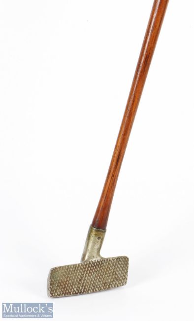 Rare J Gouick "Dundee Patent" Perfect crossline centre shafted putter c1904 the rectangular head with a curved sole stamped either side of the short hosel J Gouick Dundee and Pat no. 20623, diamond pattern face markings - c/w fine original full length hide grip with underlisting. Please note: See Jeff Ellis Cat lot 363 - "… Less than 10 examples of this club are known"