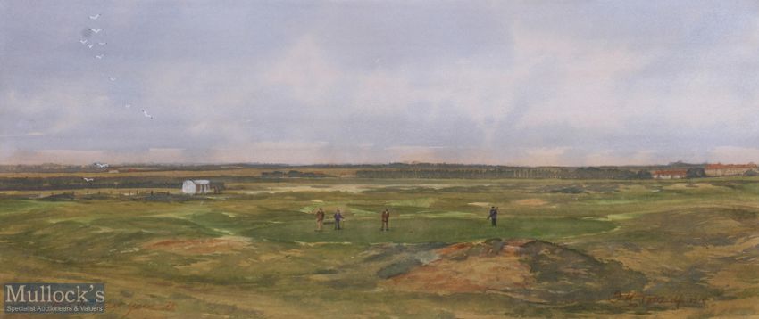 F H Partridge (1849-1929) - Great Yarmouth & Caister Golf Club - titled "5th Green Yarmouth"- watercolour featuring a fourball putting out, signed and dated 1919 to the lower right corner - image 10" x 23" - mf&g overall 19.5" x 32.5". Note: Golf Collection from "David Easby Estate"