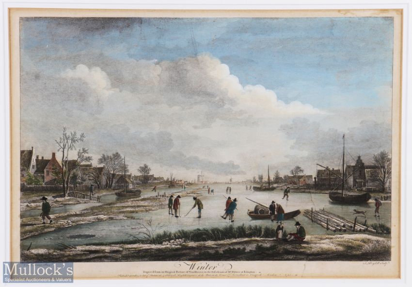 Van Drever (After) c1753 Hand coloured engraving titled "Winter" frozen river scene portraying Dutch Kolf Scene engraved by J Boydell published London 1753 - image 11.25" x 16.5" overall 19.5 x 24.25". Note: Golf Collection from "David Easby Estate"