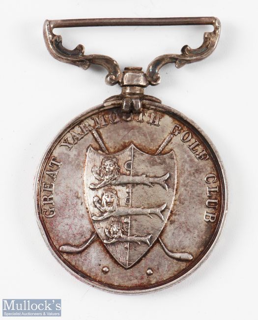 Scarce 1898 Great Yarmouth Golf Club "The Young Cup" silver medal - complete with swivel bar and the remnants of the original red silk ribbon and bar-the reverse is engraved "The Young Cup" was one by Rev K Bagnall Oakley-87.6.81-1898. Note The Great Yarmouth Golf Club was founded in 1882 - the Club arranged matches with Royal Blackheath, Felixstowe and Cambridge University. The Club was fortunate, in the early years, in being adopted by the members of Royal Blackheath who provided Captains, Officers, members and Trophies. The Club still plays the Blackheath Medal (a scratch competition) and Royal Blackheath in turn play for the Great Yarmouth Cup, donated by the members of Great Yarmouth in 1900 in recognition of all Royal Blackheath had done to assist them in establishing the game at Yarmouth. Note: Golf Collection from "David Easby Estate"