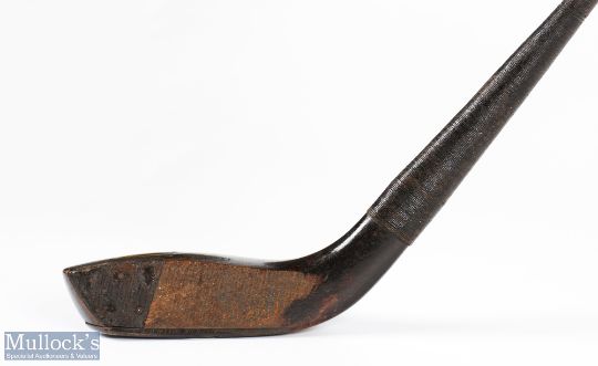 J Morris dark stained beech wood longnose deep faced brassie c1885 - head measures 5"x 1.75" x 1.25" deep with leather face insert to the toe and fitted with 46" greenheart shaft stamped C Plummer just below the original full length hide grip with cloth underlisting. Note: Golf Collection from "David Easby Estate"