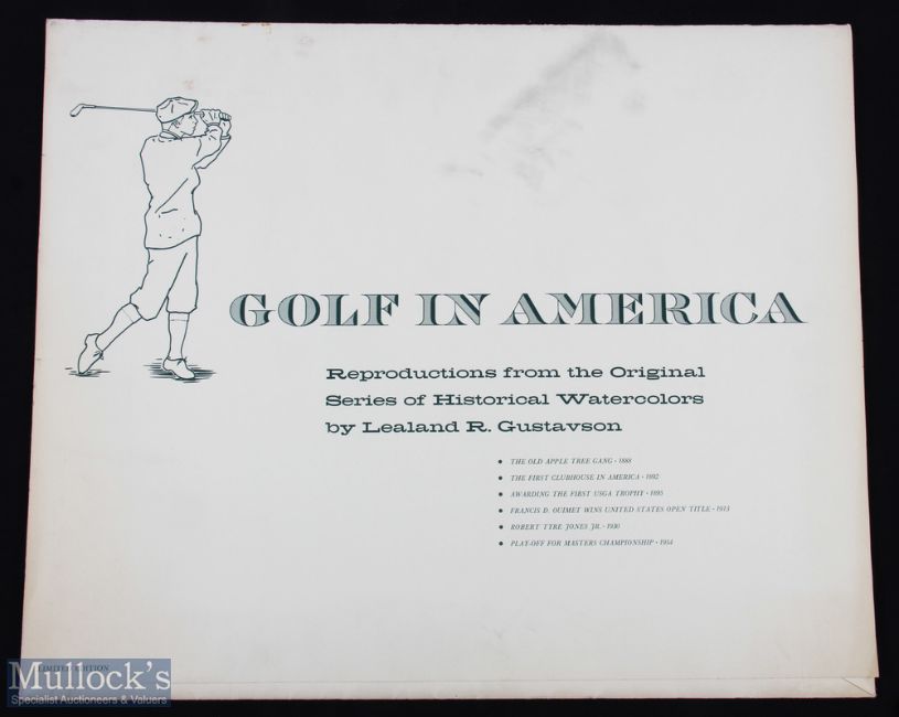 Golf in America Lealand R Gustvson - a set of 6 limited edition Prints of the Old Apple Tree, the first club house in America, awarding then first USGA trophy, Francis D Quimet wins United States Open Title, Robert Tyre Jones, play-off for the Masters Championship 1954, within original card folder