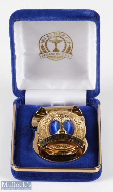 2004 Official Ryder Cup Presentation Gilt Embossed and Engraved Players/Official Money Clip - played at Oakland Hills C.C - with oval blue centre - made by master Jeweller and Sculptor Malcolm DeMille Inc USA - comes in maker's original box.