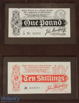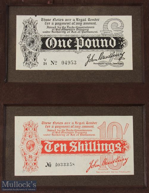 Banknotes - Bradbury treasury notes issued during WWI in the sums of £1 and 10/-, good condition, though laid down to board with remains of a former frame. These were some of the first banknotes to be issued. They were issued at a time when the Government feared that the public would hoard the gold sovereigns and half sovereigns at a time when Europe was in crisis. As a result, it was decided to issue paper money to the same value of £1 and 10/-. The notes were printed on paper that was earmarked for the printing of stamps, and printed on one side only, and were 'signed' by the then Chief Cashier at the Bank of England, John Bradbury.
