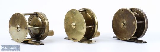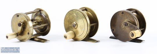 3x Small Victorian Brass Trout Reels - 2.25" Jones, 111 Jermyn Street, London and two multiplying reels, 2" and 2.25" both with bone handles, both unnamed, narrow drum example movement needs attention (3)