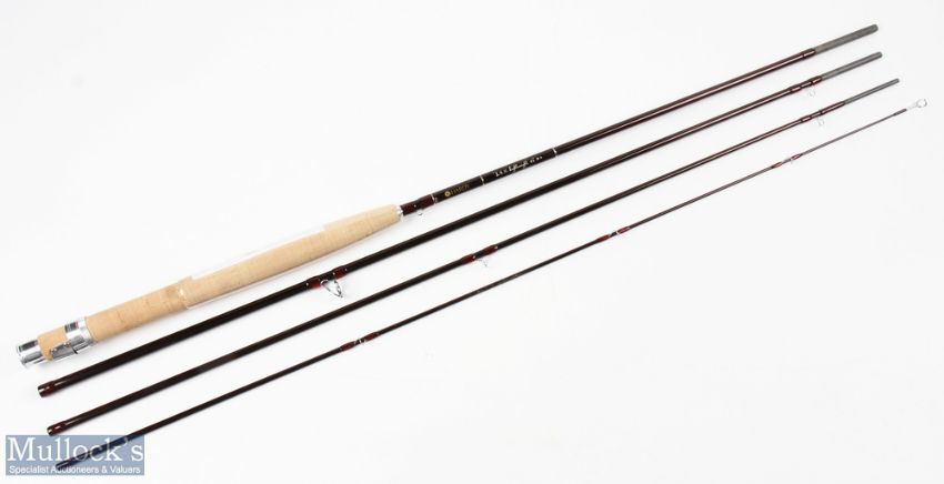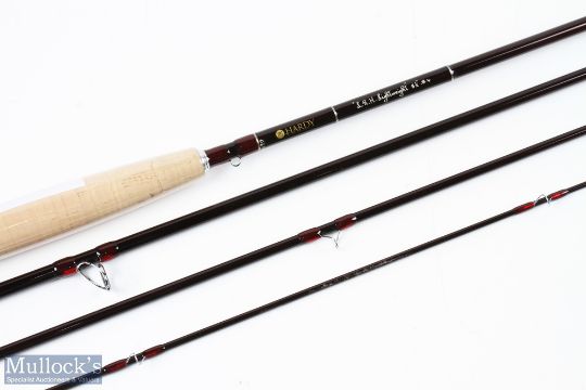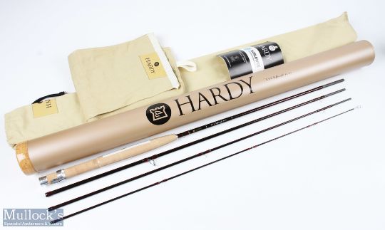 A very fine Hardy Alnwick LRH lightweight carbon stream/brook fly rod 8' 6" 4pc line 4# alloy universal sliding reel seat and collars, agate lined stripping ring, alloy accords, looks unused, plastic still on handle, MCB, alloy tube and cover