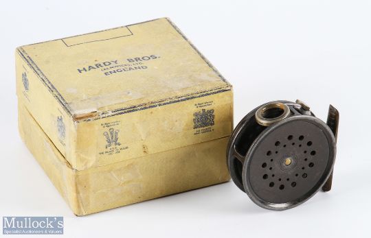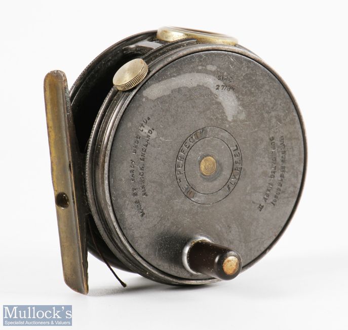 Hardy Bros "The Perfect" Duplicated Mk II fly reel, 2 7/8" spool, black handle, milled rim tensioner, clear agate line guide, notched brass foot, light use, runs very well, in non-original box