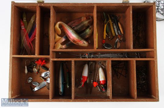 2 Tackle Boxes with contents of Lures, Spinners Minnows, spoons trace, single double, triple hooks, jelly lures, lead shot, floats, folding landing net with noted makers of Mepps, NB all too be sold for charity funds Hollins Park Hospital