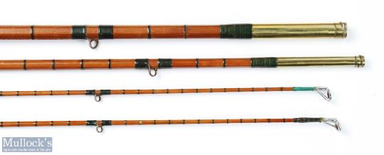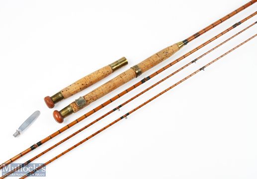 J J S Walker Bampton Alnwick split cane trout/light salmon fly rod No 8531, 11' 3pc, with spare tip, with 6" extendable handle, brass sliding reel fittings and collars, red agate butt/tip rings, brass twist lock joints and alloy butt spear, very original, cloth bag