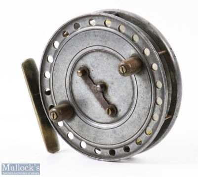 Homer 4 1/8" 'Flick-Em' Heaton Made Reel twin wooden handle, brass foot, nickel silver line guide, stamped to rear 'Flick-Em', runs smooth, some movement to the drum