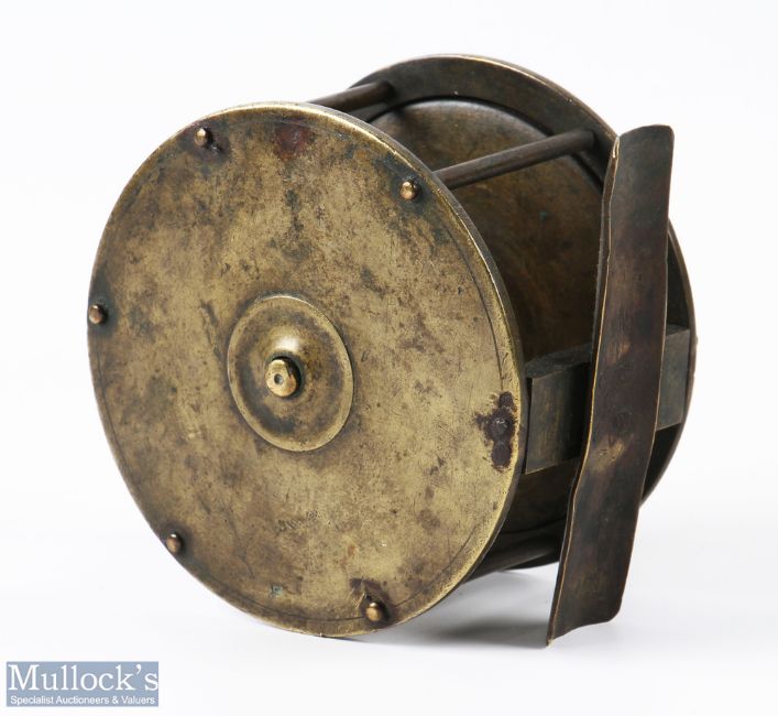 Mid 19th Century Brass Crank Wind 3.5" Reel c1830s, with pin through pillars, stamped '8' on bridge, wooden handle, foot mishappen, run smooth