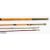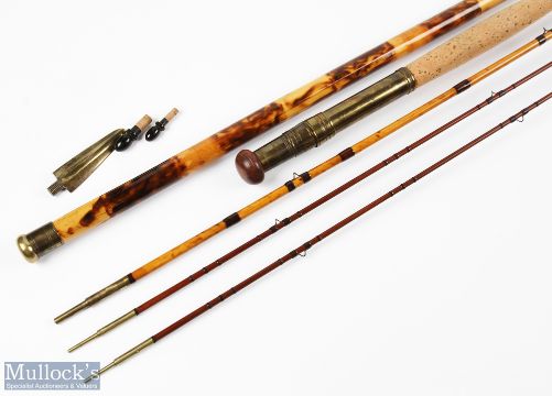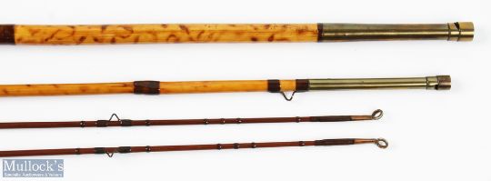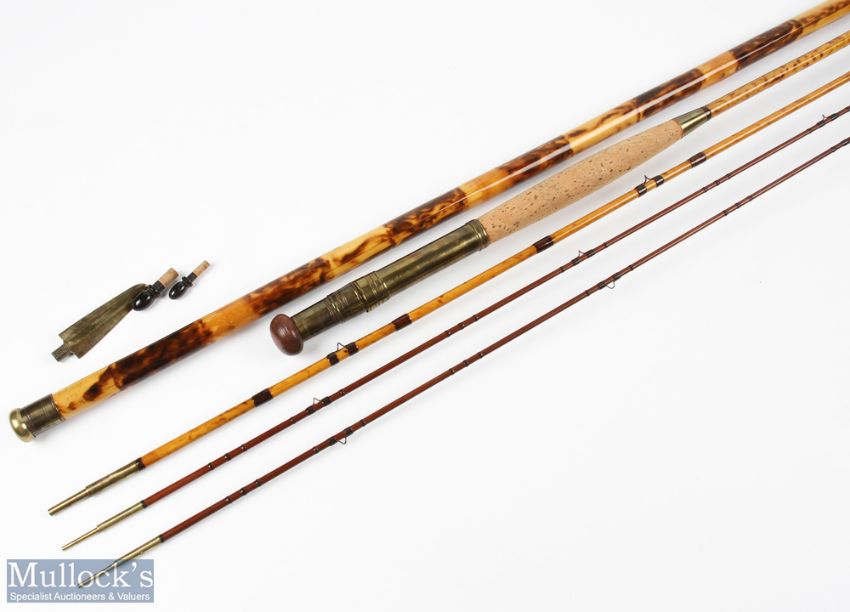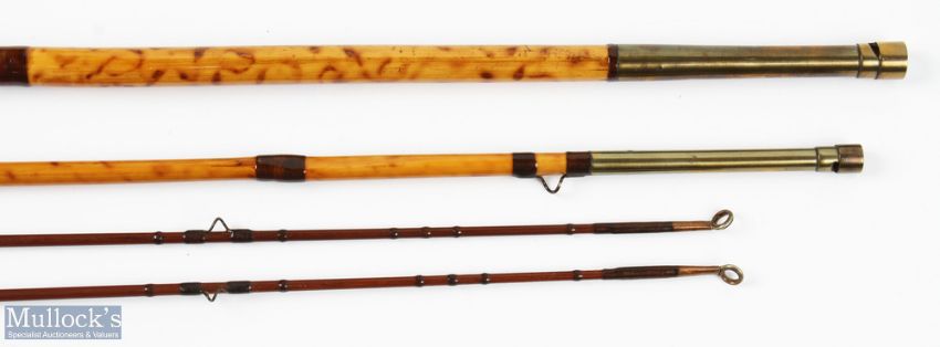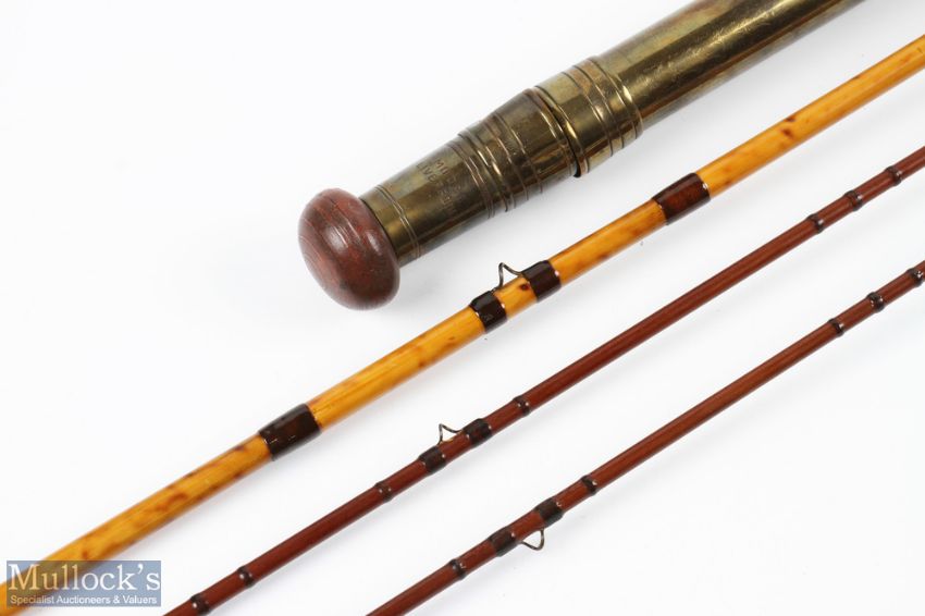 Moore Liverpool whole flamed cane with greenheart tip with spare tip, brass reel seat and collars, 12' 3pc, interesting twist pin lock, brass ferules, red agate, butt ring, tip tube, flamed bamboo with brass screw top and threaded end for landing net, cloth bag, brass spike, cloth bag