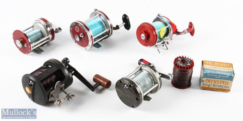5x Assorted Multiplier Sea Reels - inc Okuma Model TA50, Quantum Blue Runner, Shakespeare 2152, Pfleuger Sea King No. 2288 and Intrepid Sea Streak with boxed spare spool, all run smooth in used conditions (6)