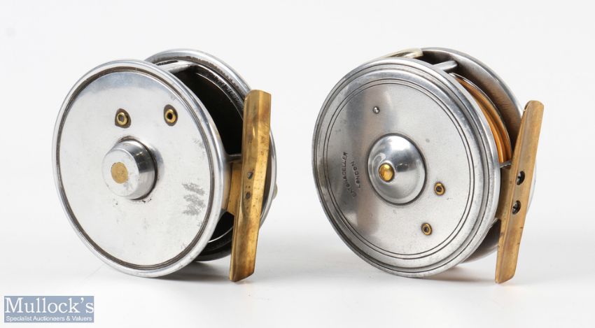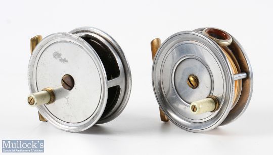 A fine Eaton & Deller alloy fly reel, 3" spool with white handle, brass screw spool release, 5 pillar framed agate line guide, smooth brass foot; unnamed alloy fly reel 3" spool with brass screw release, 4 pillar frame, smooth brass foot, runs well (2)
