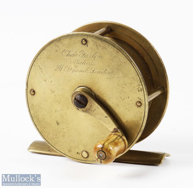 Mid Victorian Farlow 3" Brass Crank Wind Fly Reel with raised check housing to rear, bone handle, script 191 Strand address marking to front, run smooth