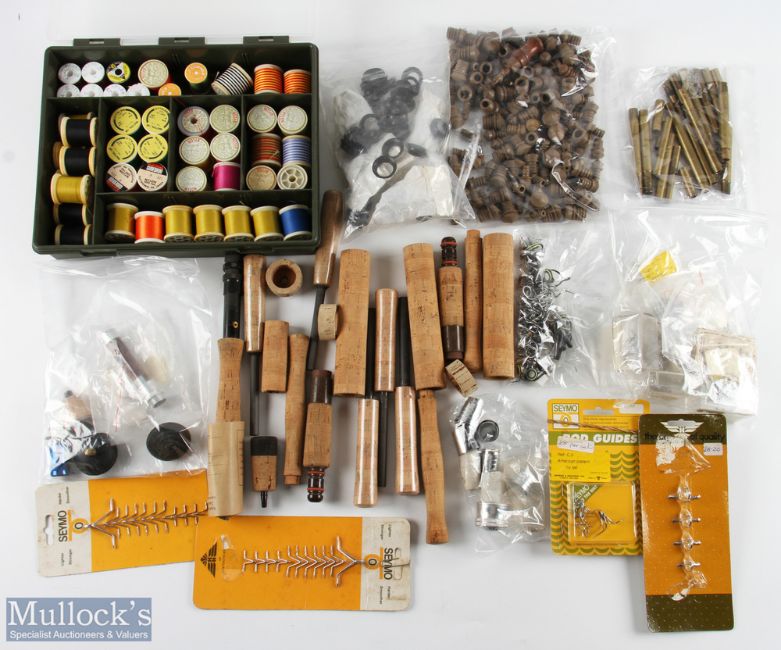 This lot is for the rod builder/refurbisher: a massive collection of rod rings, collars, reel seats, cork handles, buttons, rubbers, brass ferrules, ferrule stoppers, case with 46 spools of whipping thread (qty)