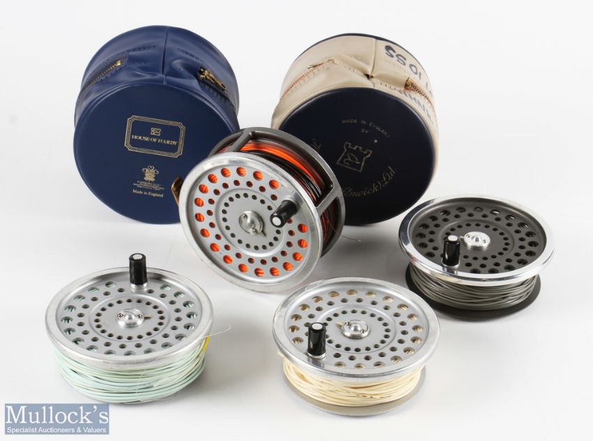 Hardy Bros "Marquis" salmon No 2 alloy fly reel with 3 spare spools, 4 1/8" wide spool, 2 screw latch, rear tensioner, ribbed brass foot, with two MZCs, light use