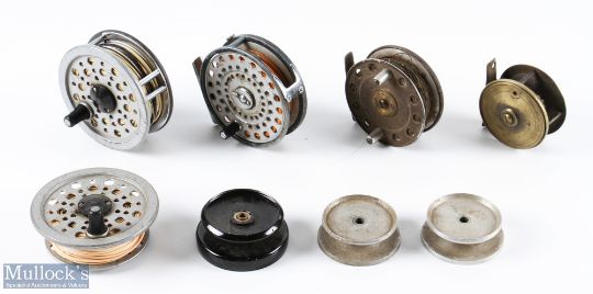 Roday Japan 320 alloy fly reel, 3 3/8" spool, 2 screw latch (lightweight copy), milled rim tensioner, fixed check, runs okay, signs of wear; Shakespeare Beaulite fly reel and spare spool, 3.5" spool, 2 screw latch, rear tensioner, runs okay, in zip case; 2x unnamed reels and 3 spools (3)