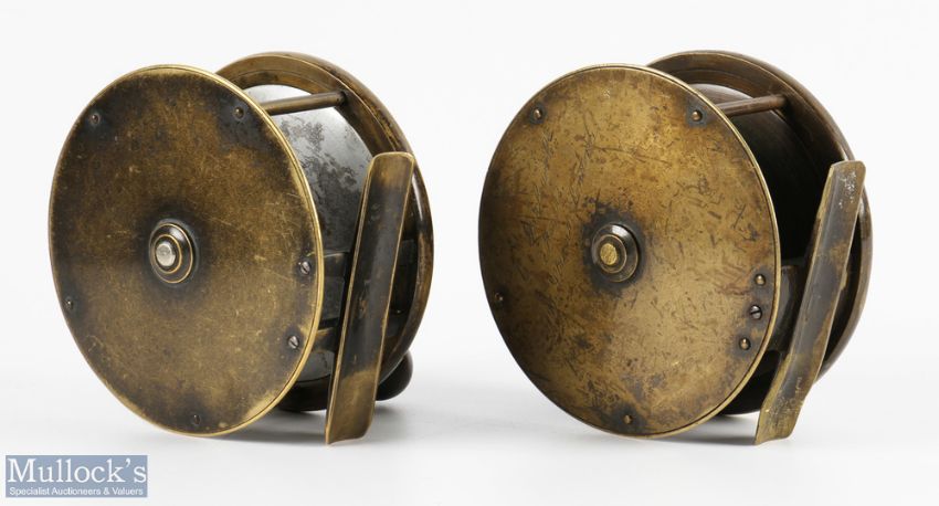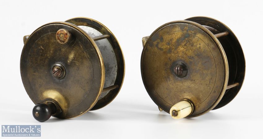 Farlows brass and alloy reel 4 1/8" wide plate wind spool with bulbous brass mounted handle with counterbalance (original?), constant check, looks original, runs well, fish logo to seat; C Farlow & Co, 161 The Strand, London, 4 1/8" wide spool with brass mounted horn handle, constant check, a little stiff (seat has slight bend) (2)