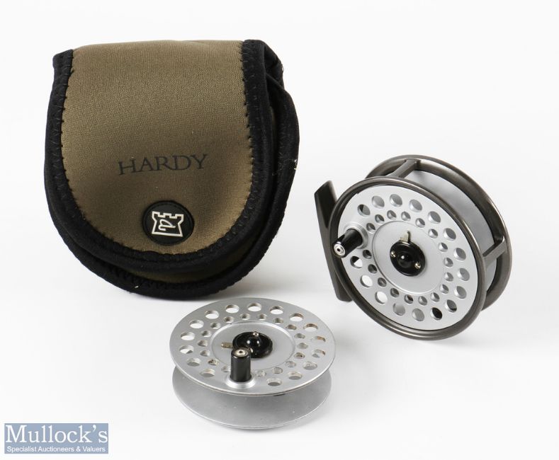 Hardy Bros "The Viscount 130" alloy trout reel and spare spool, 3.25" spool, 2-screw latch, rear tensioner, looks unused in neoprene pouch