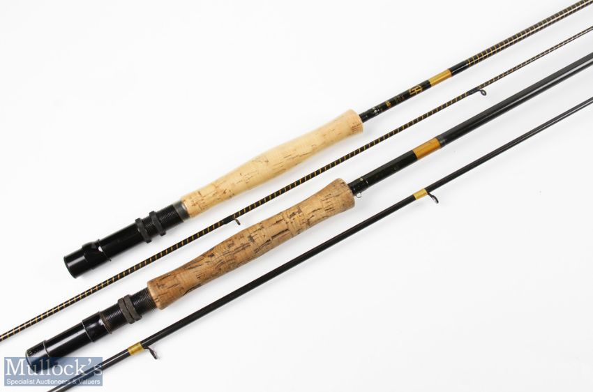 Dynaflex "The Church Hill Gold" No 989.469 fly rod 8' 2pc line 6/7#, double down locking reel seat, lined rings throughout, cloth bag, black plastic tube, light use, plastic still on handle; unnamed carbon fly rod 10' 2pc, line 8/10#, alloy double down locking reel seat, lined rings throughout, cloth bag, black tube (2)