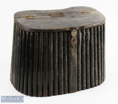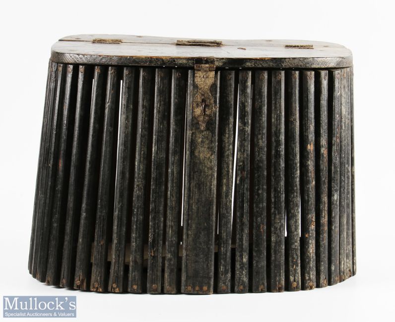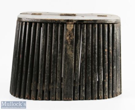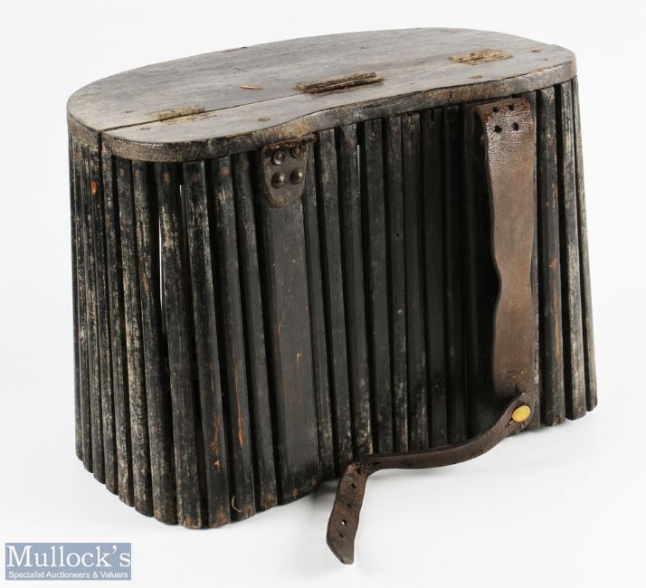 Victorian dark stainedpPine slatted Creel with iron hinge latch and hinges, one a/f, with a part length of leather strapping to rear, size 36cm x 23cm x 29cm