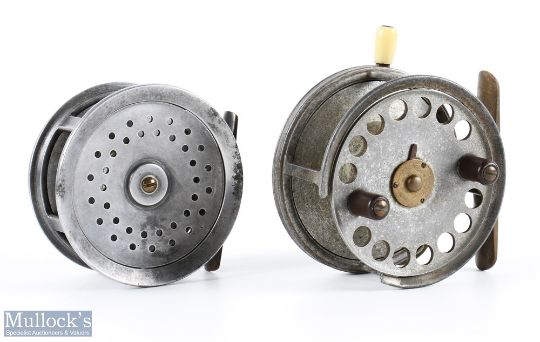 Hardy Bros Silex No.2 4.25" Reel twin brown handle, smooth brass foot, rim tensioner, ivorine rim lever, quarter section of rim broken and missing, runs smooth with strong check, well used condition, together with a Perfect style Army & Navy "" reel, ivorine handle, smooth brass foot, rim tensioner, check not working with non-original holes to rear, small corrosion to rim (2)