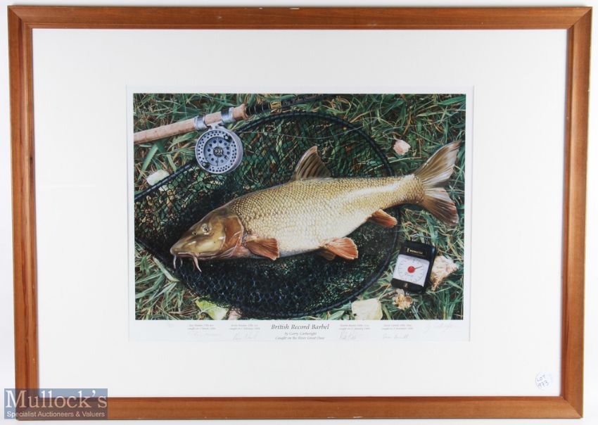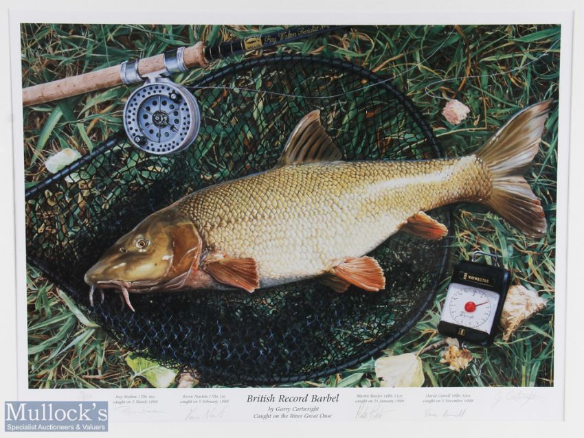 British Record Barbel by Garry Cartwright 1999 multi signed Fishing Print, signed by Ray Walton, Kevin Newton, Martin Bowler, David Currell, a large framed and mounted under glass with wooden frame - size #77cm x 107