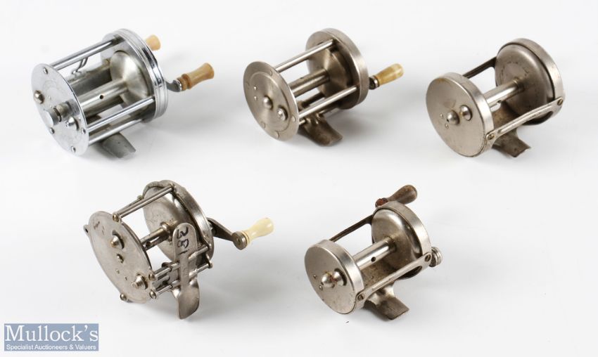 5x USA Small Multiplier Reels inc Pflueger Trump with twin handle, sliding guide, with Portage Topic No.123, Nif Tee No.1314 and Atlas plus Union Hardware Company No. 7200, all in used conditions, run smooth (5)