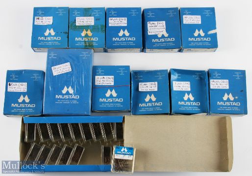 Quantity of Mustad Fishing Hooks: in original retail boxes - to include 15x size 16 up eye dry fly, 3x size 14 down eye wet fly, 20x size 12 old English bait hooks, 5x size 18 up eye dry fly hooks, 16x size 16 down eye wet fly, 10x size 8 down eye long shank fly, 9x size 12 old English bait, 14x size 16 up eye dry fly hooks,19x down eye fly hook, 5x size 10 down eye long shank fly, 17x boxes 79580 size 6 Viking longshank lure, 20x size 8 down eye wet fly hooks all look to be packets of 50s