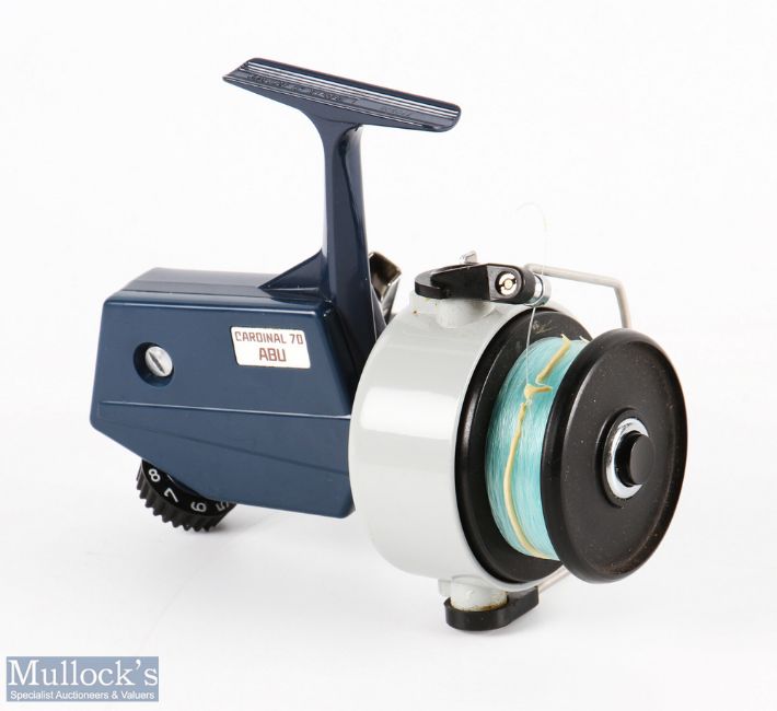 Abu Cardinal 70 fixed spool reel LHW, brass mounted tensioner, push button spool release, good bail, with spare spool in red case, tool instructions and original box, light use, runs very well