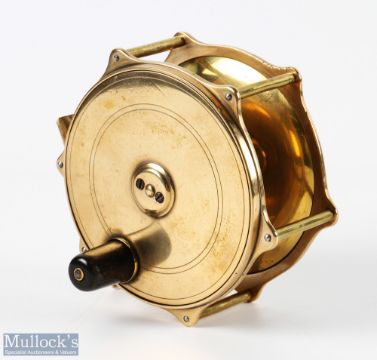 Unnamed Birmingham style brass salmon reel 4" wide spool with oversize handle, raised pillars, roller constant check, looks very original, foot filed