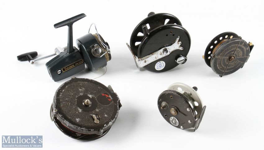 Daiwa No 760 fixed spool reel, good bail, runs well, in Angling Times zip case; Harris Ensign composite reel, 4.5" spool, twin handles, rim on/off check, runs well; 3x assorted centre pin reels, Strike Right and K P Morritt, all needing attention (5)