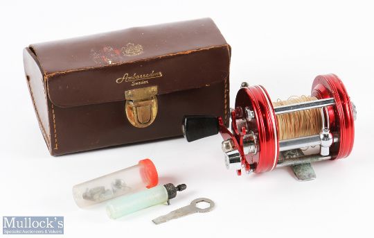 Abu Ambassadeur No 6000 multiplier reel seat No 080802, runs very well, in leather case with oil and tools