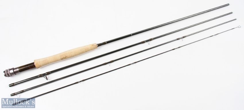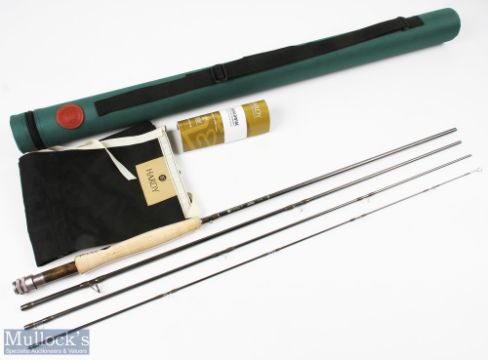 A fine Hardy Alnwick "Jet" Sintrix carbon fly rod 9' 4pc line 5# alloy double uplocking reel set with burr wood insert, lined butt ring, MCB and tube, looks unused, plastic still on handle, with original warranty card