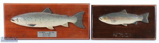A pair of "Trophies" of Fish caught by Lionel Sweet - A Salmon on the Usk 1938, 11" x 5"; A Trout at Blagdon 1959, 9" x 4.5". On hardwood stands. Very nice.