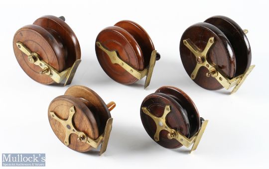 Group of 5 Wooden and Brass Reels - inc 3 Starback examples, 2x 3.5" with Slater's latch, and the other 4.5" example with brass flange, with 2x 4" strapback reels, all unnamed (5)